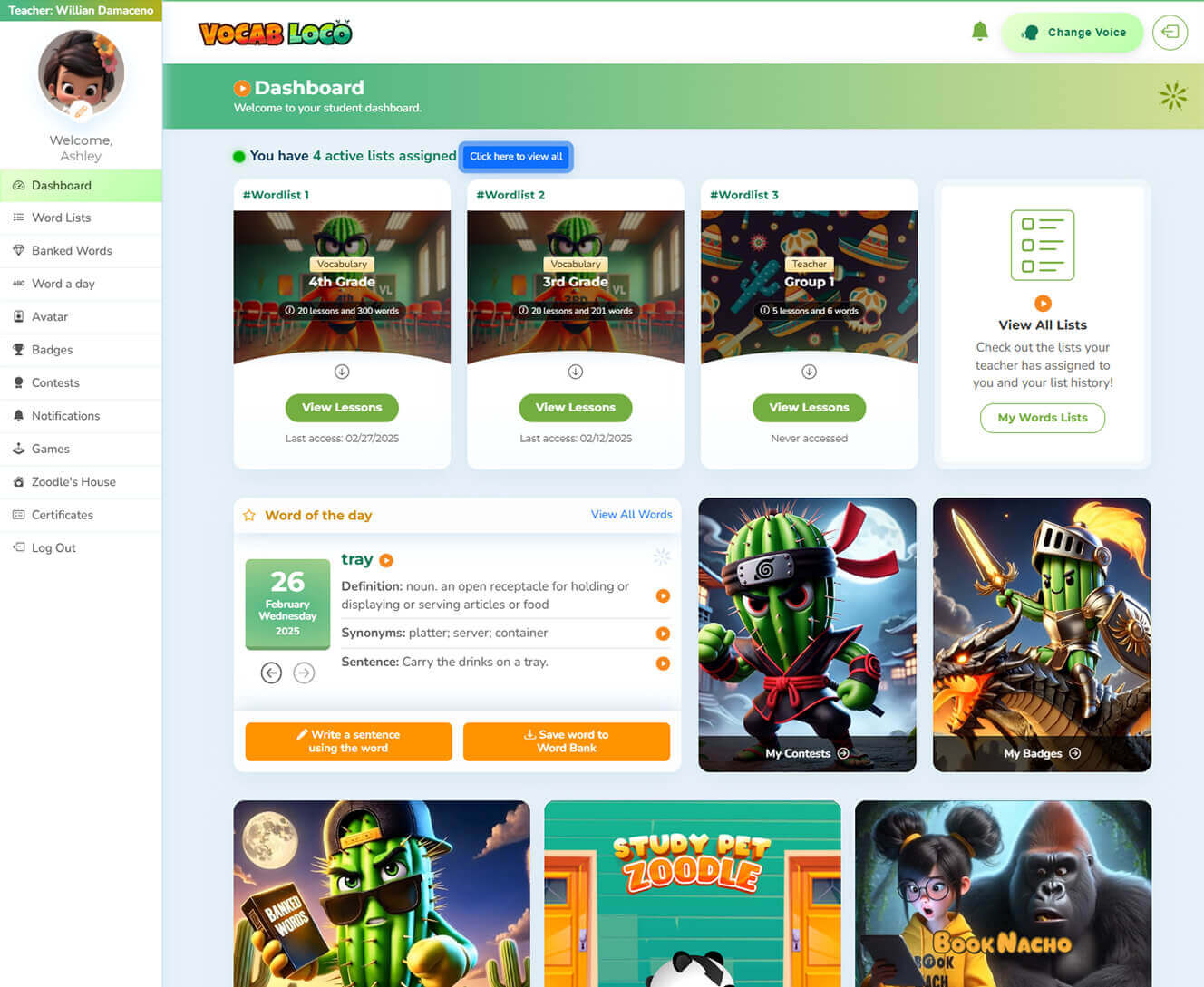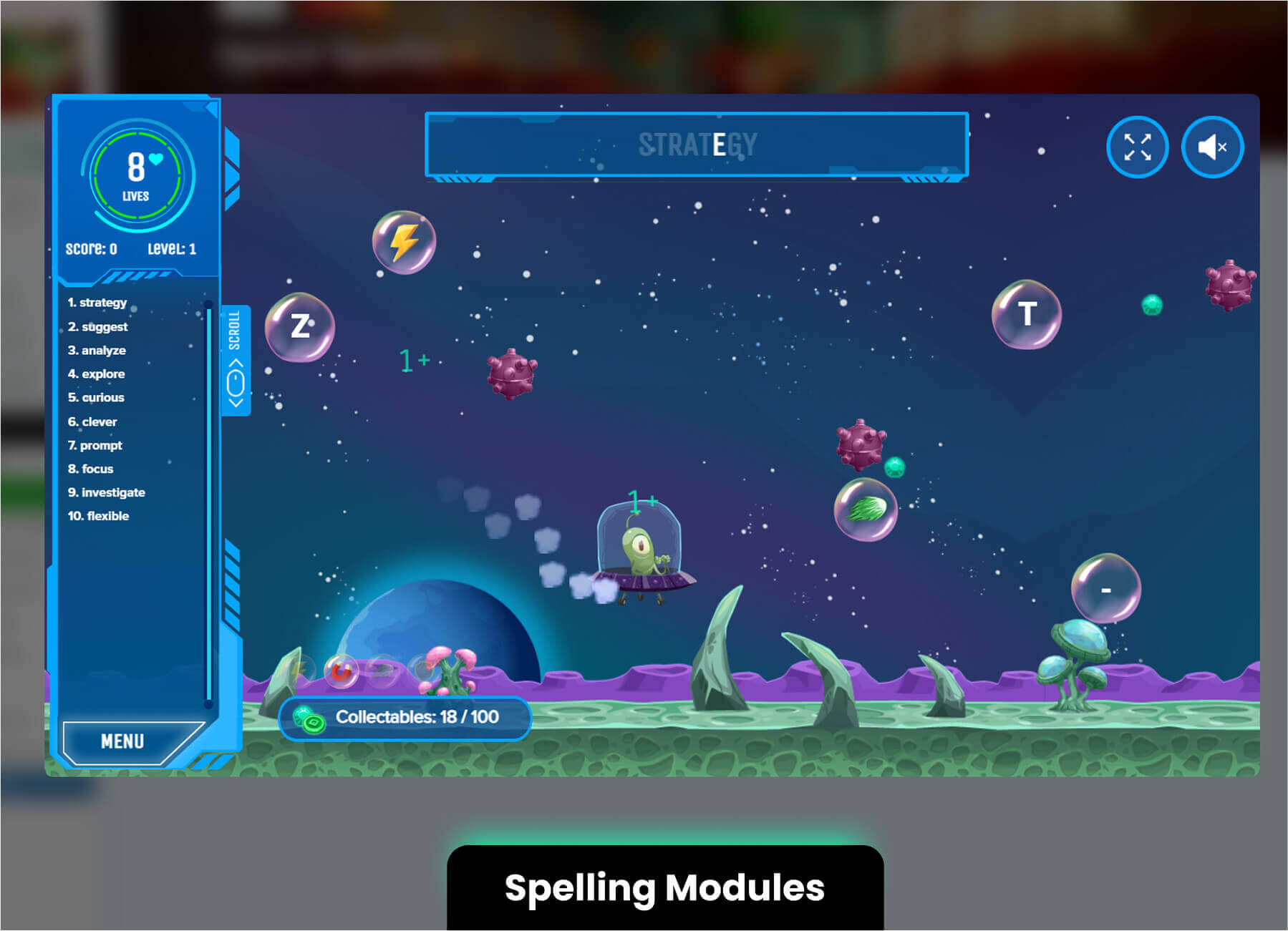 Students explore word lists through an interactive platform packed with engaging activities. They start with foundational exercises and gradually tackle more complex challenges, including spelling games, vocabulary challenges, song-based learning, and creative writing.
