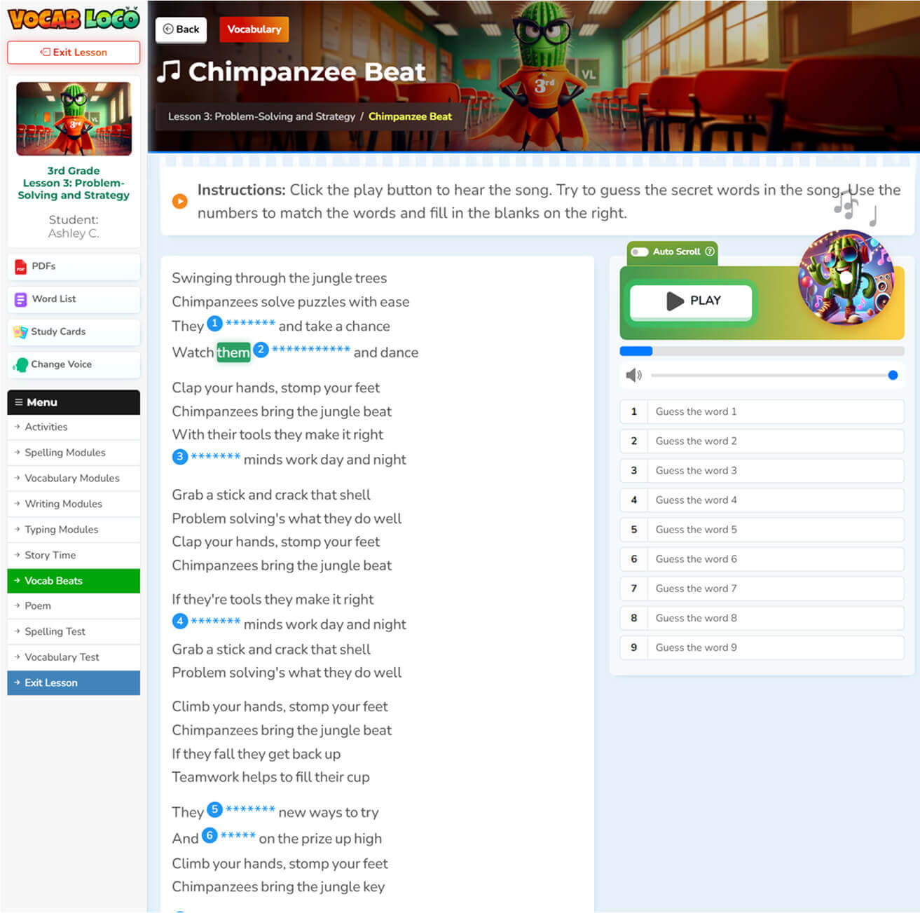 Vocab Loco’s Vocab Beats module turns vocabulary practice into a musical adventure. Students listen to custom songs that incorporate words from their assigned word list, transforming language learning into a fun and rhythmic experience.