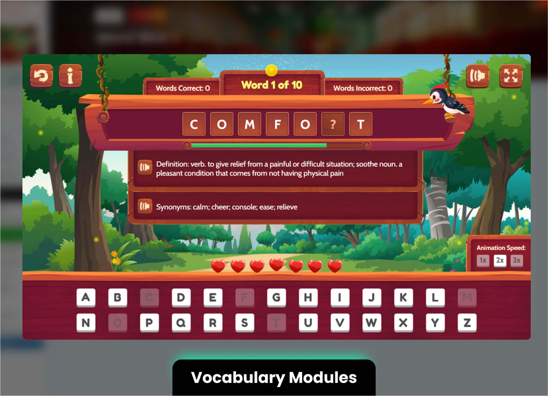 This module not only strengthens word recognition and comprehension but also adds an element of play, making vocabulary practice feel more like a game than a lesson.